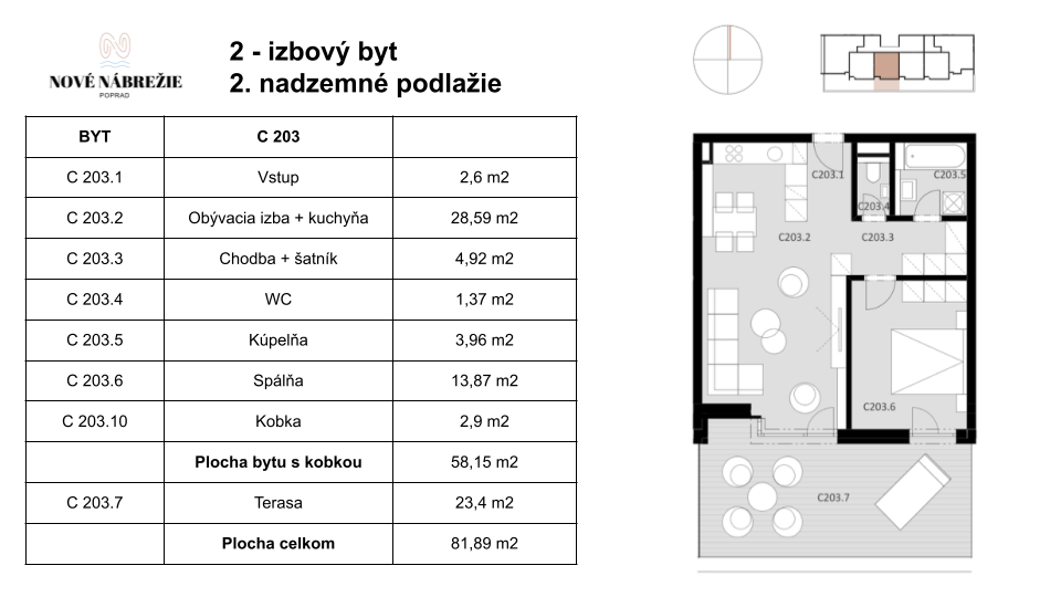 – 2 izbový 58,15 m2 s kobkou, ktorá má 2,9 m2 je na tom istom poschodí