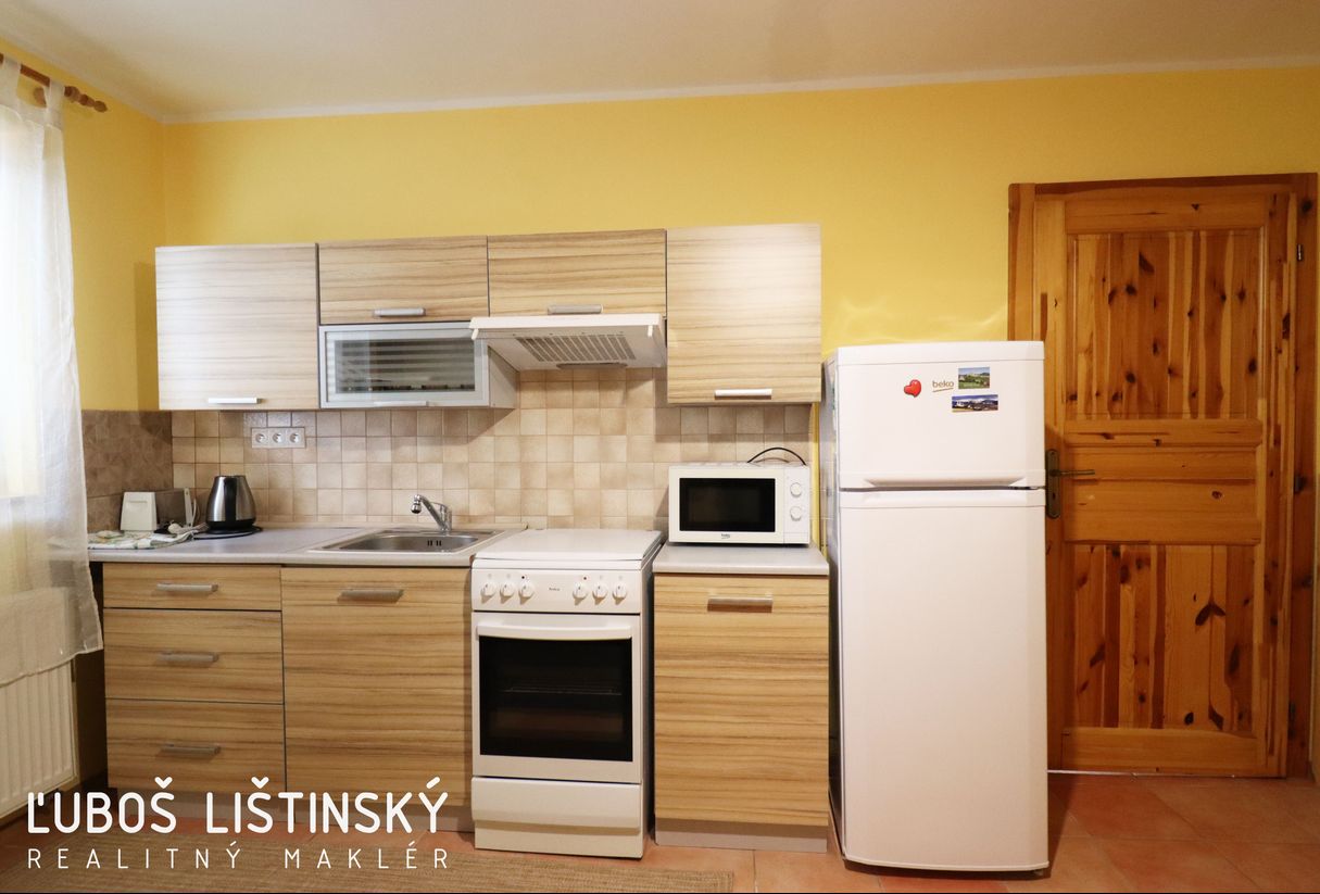 – v kuchyni sa nachádza jedálensky stôl so stoličkami, plynový sporák s elektrickou rúrou, chladnička s mrazničkou